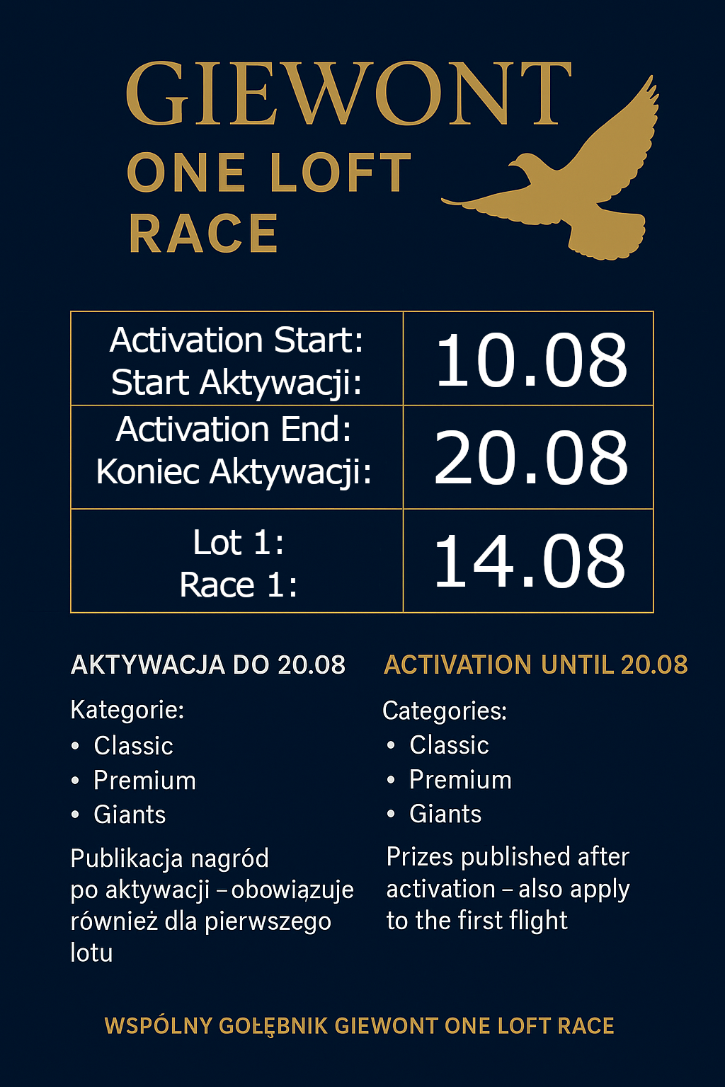 Laureaci pierwszego lotu otrzymają nagrody zgodnie z aktywacją w danej kategorii gołębi.