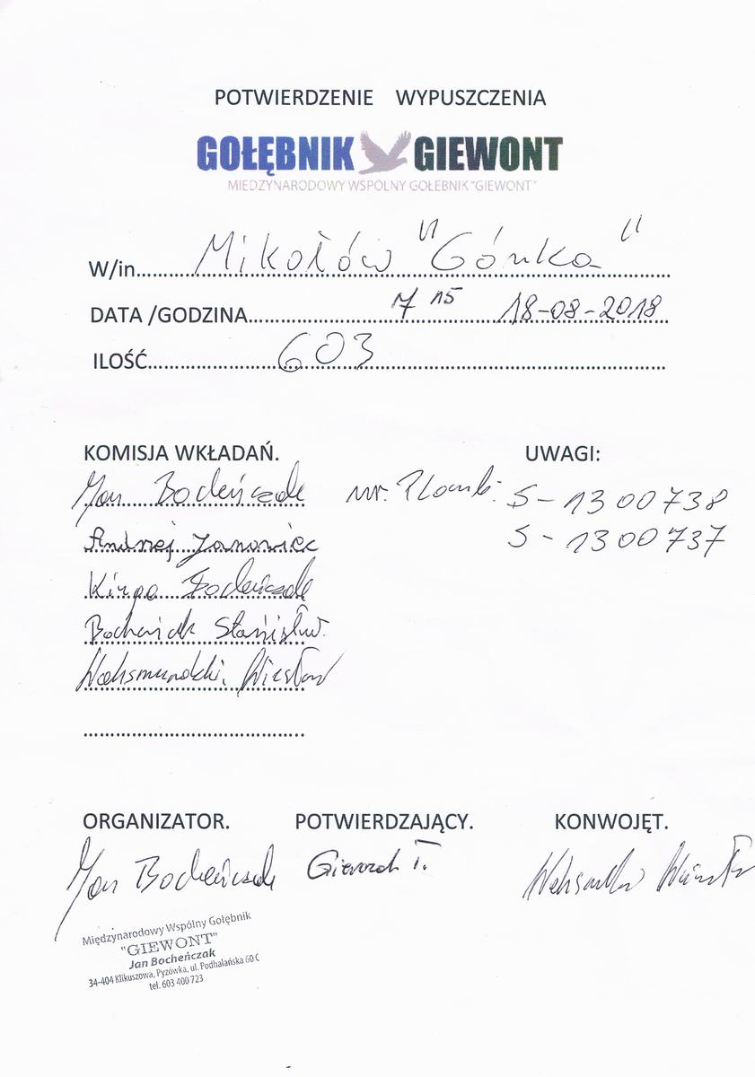 Poniżej znajdują się filmy z wypuszczenia gołębi z pierwszych 4 lotów konkursowych, oraz potwierdzenia wypuszczenia gołębi: